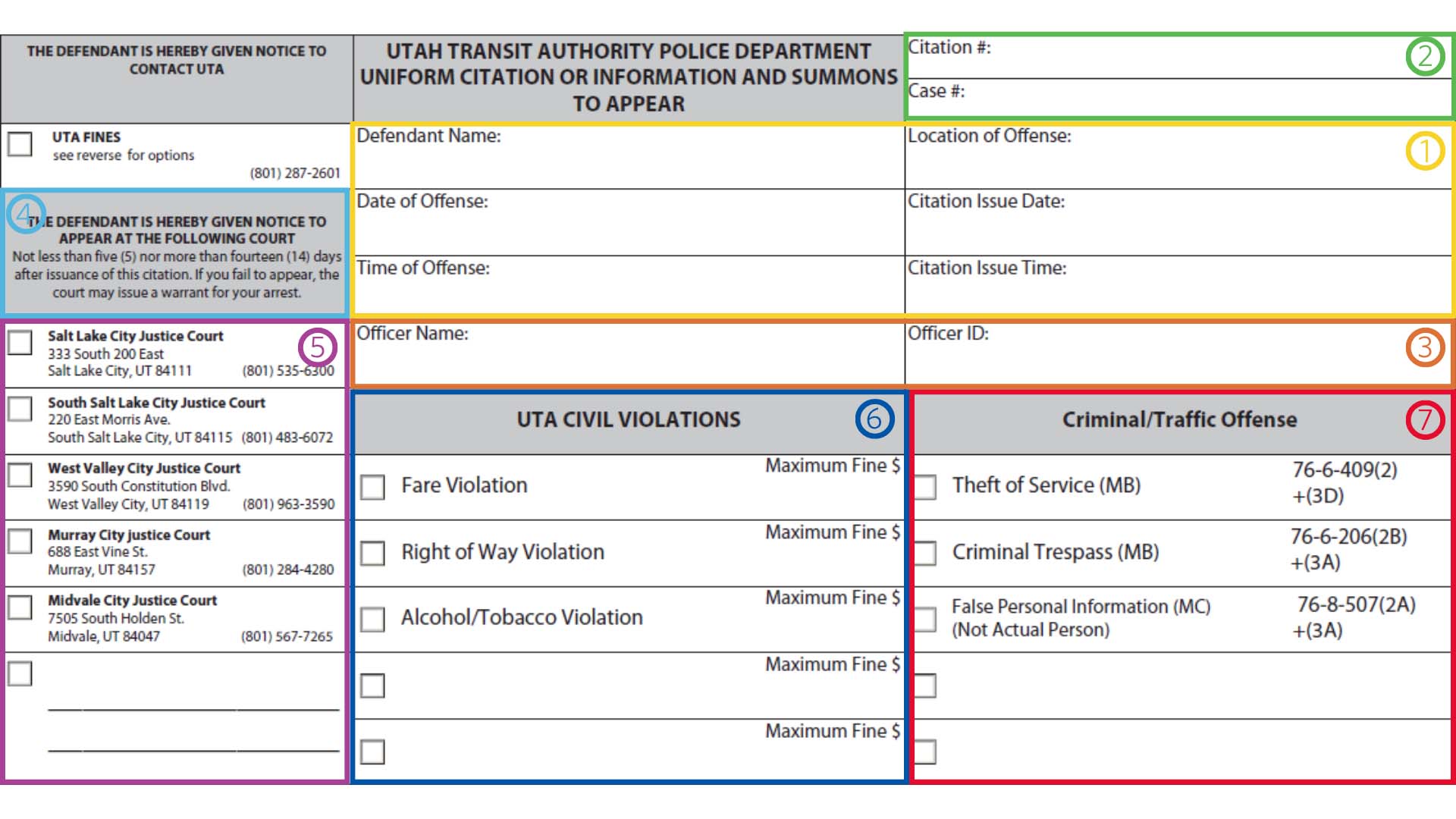 6. UTA Civil Violations: These are non‑criminal violations handled by UTA’s internal process. Please call 801‑287‑2601 if you have questions or need assistance.